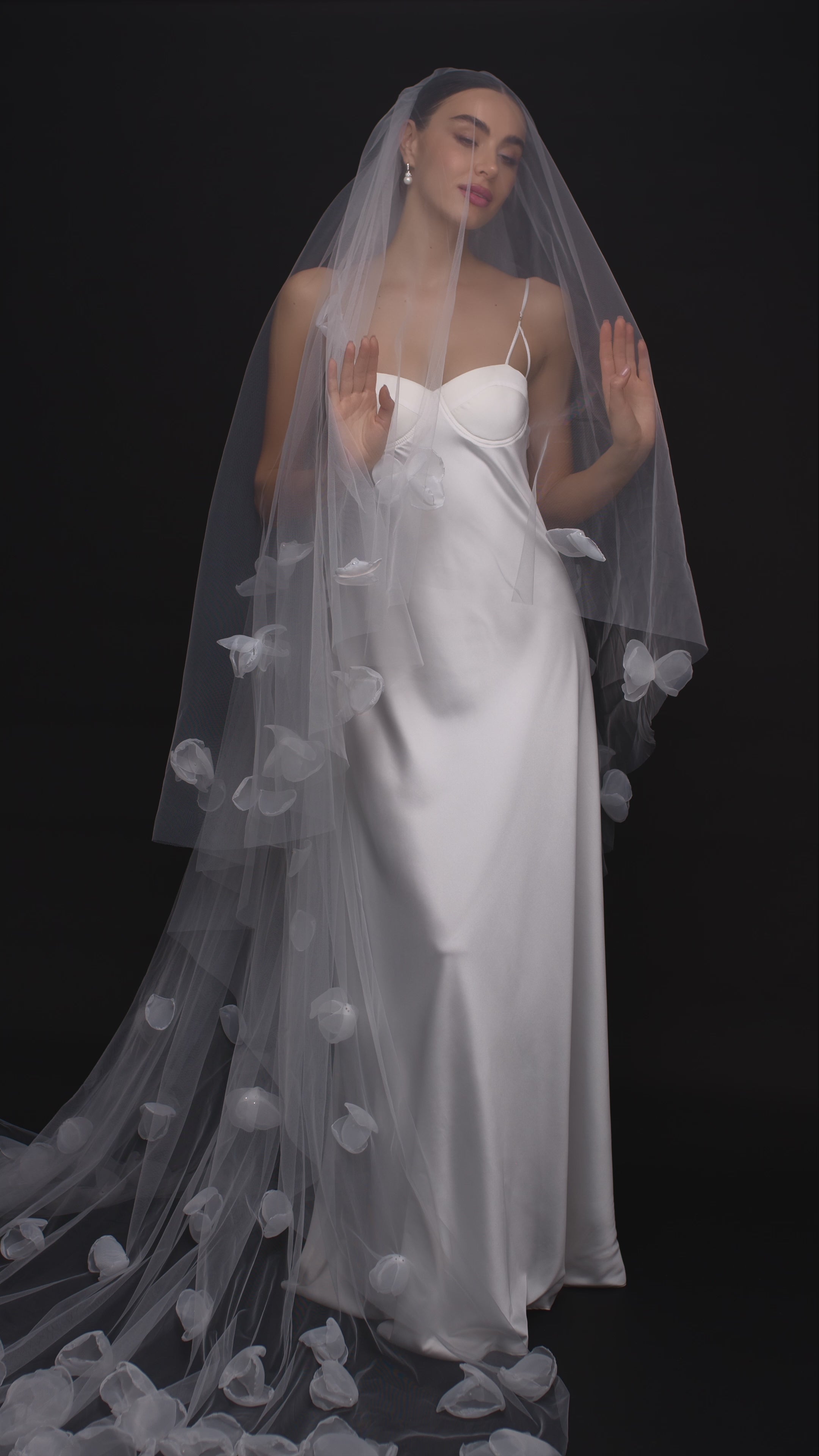 A veil sculpted by fire, created for love stories that burn bright. The Astra veil is a true couture masterpiece, with each airy petal hand-shaped over an open flame to ensure a unique, organic beauty. Crafted from lightweight sheer organza, the veil features 3D petals delicately connected with tiny pearls, creating a sense of effortless movement and depth.