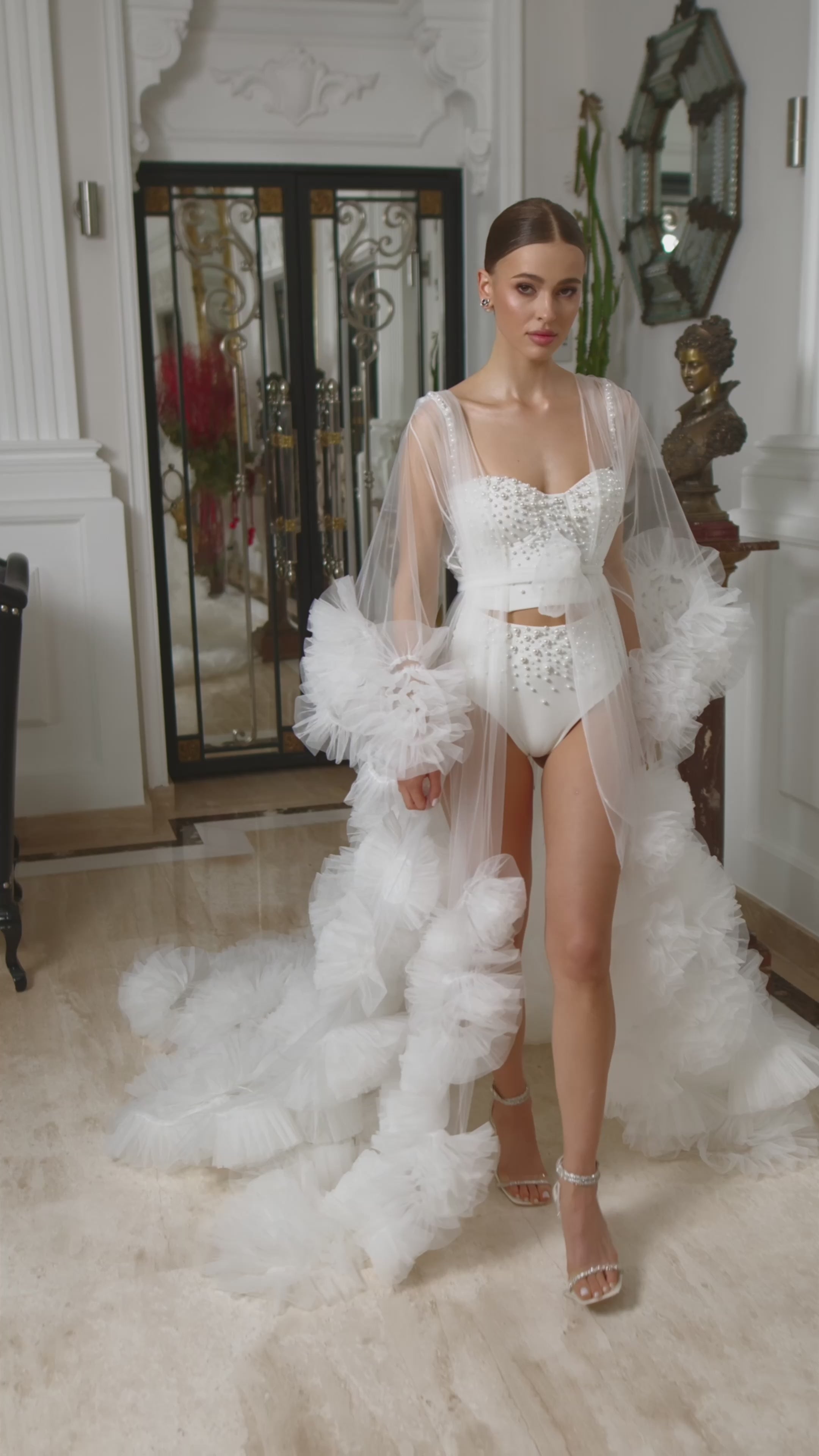 Pair the robe with the "Iris Crystal lingerie set" for a refined bridal look. The "Iris Crystal lingerie set" is not included.