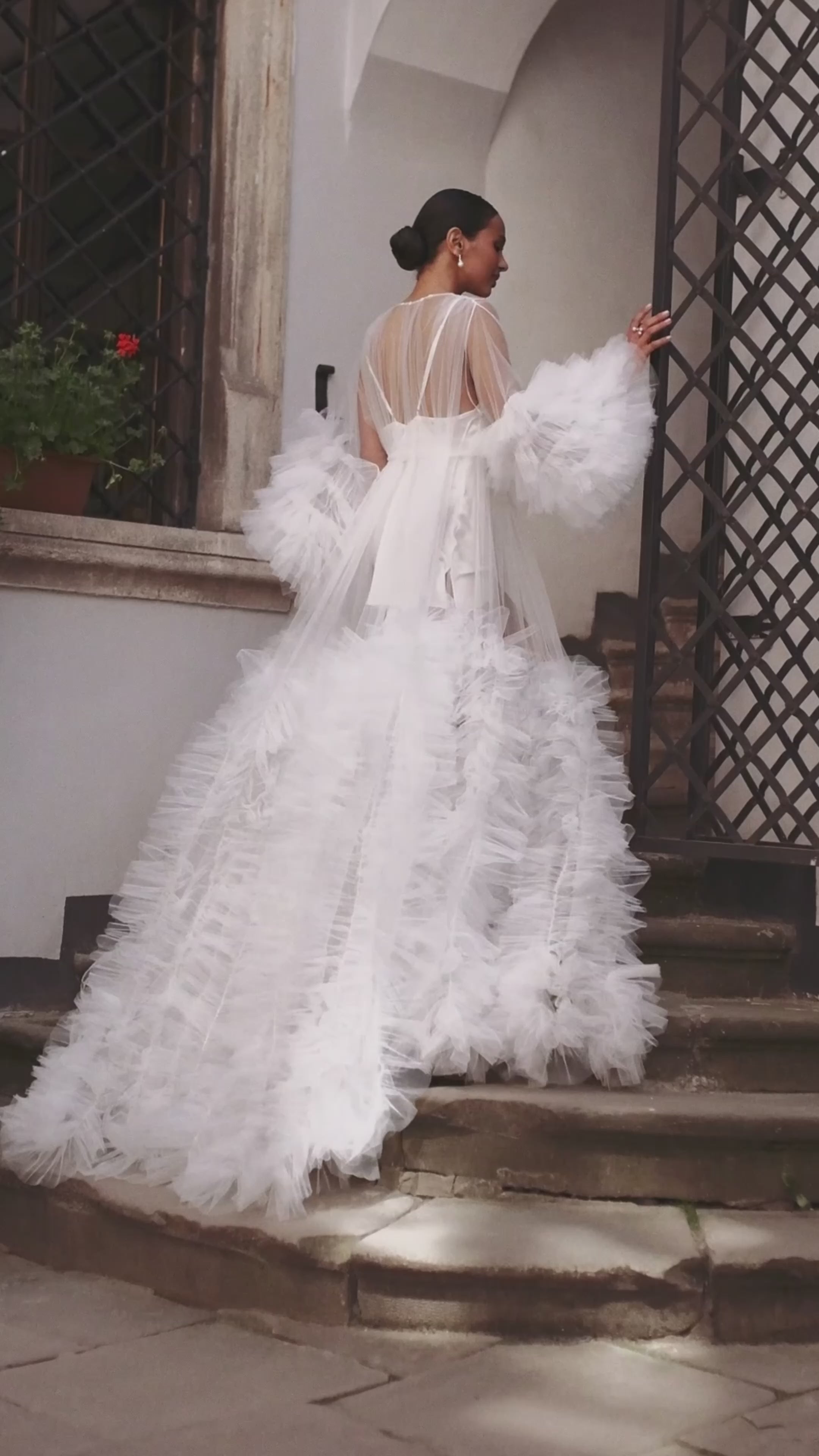 A show-stopping bridal robe designed to turn heads and leave a lasting impression. Delicately crafted from layers of airy tulle, the robe features intricate ruffles that evoke the soft, whimsical beauty of sea foam. The voluminous sleeves and dramatic train effortlessly elongate the silhouette, creating a graceful and romantic look. An adjustable belt ensures a flattering fit, while the luxurious design makes it a perfect choice for your bridal morning.