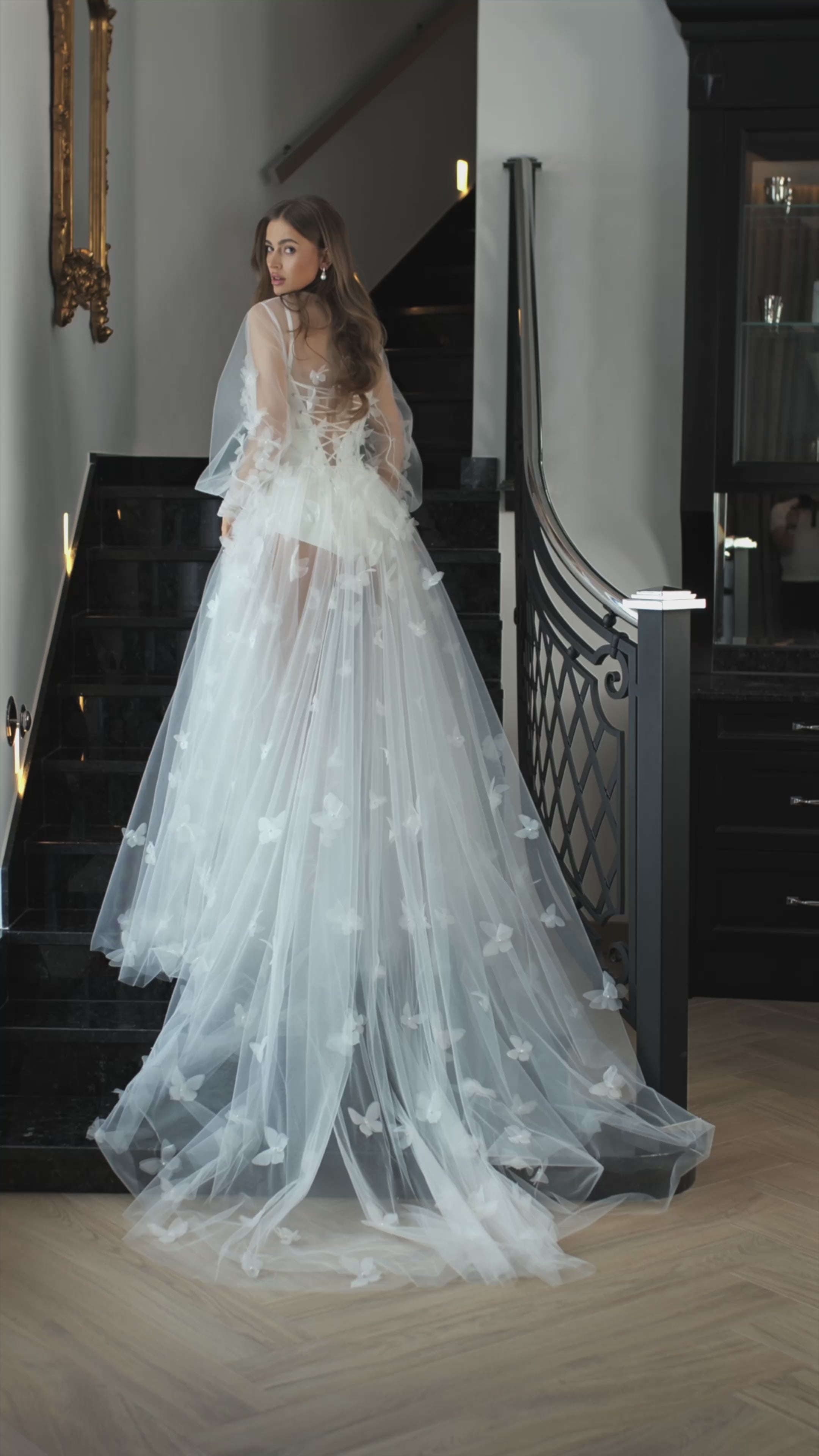 Each butterfly is fastened by hand with pearls. This robe perfectly emphasizes your figure and the long train helps to stretch the silhouette of your body. The Adelle robe has light flowing sleeves with draped cuffs decorated with silk buttons that perfectly accentuate this piece.